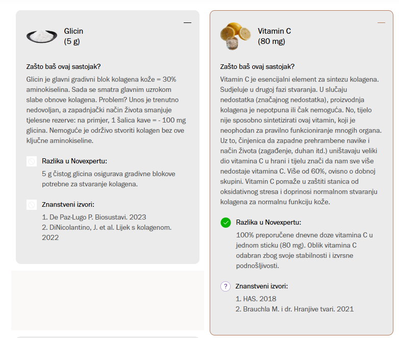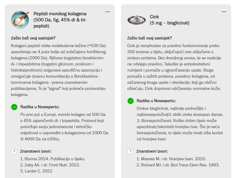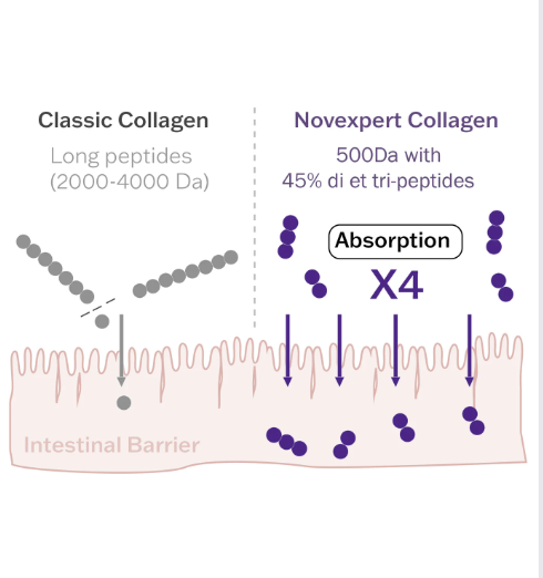 Morski i goveđi kolagen imaju koristi od aminokiselina potrebnih za sintezu kolagena u koži. Novexpert Laboratories odabrao je morski kolagen iz sigurnosnih i objektivnih razloga. Najproučavaniji kolagen u znanstvenim publikacijama je morski kolagen. Nadalje, stručnjaci Novexperta željeli su kolagen s zajamčenim postotkom di- i tripeptida za bolju apsorpciju i učinkovitost, a to je bilo moguće samo s morskim kolagenom.